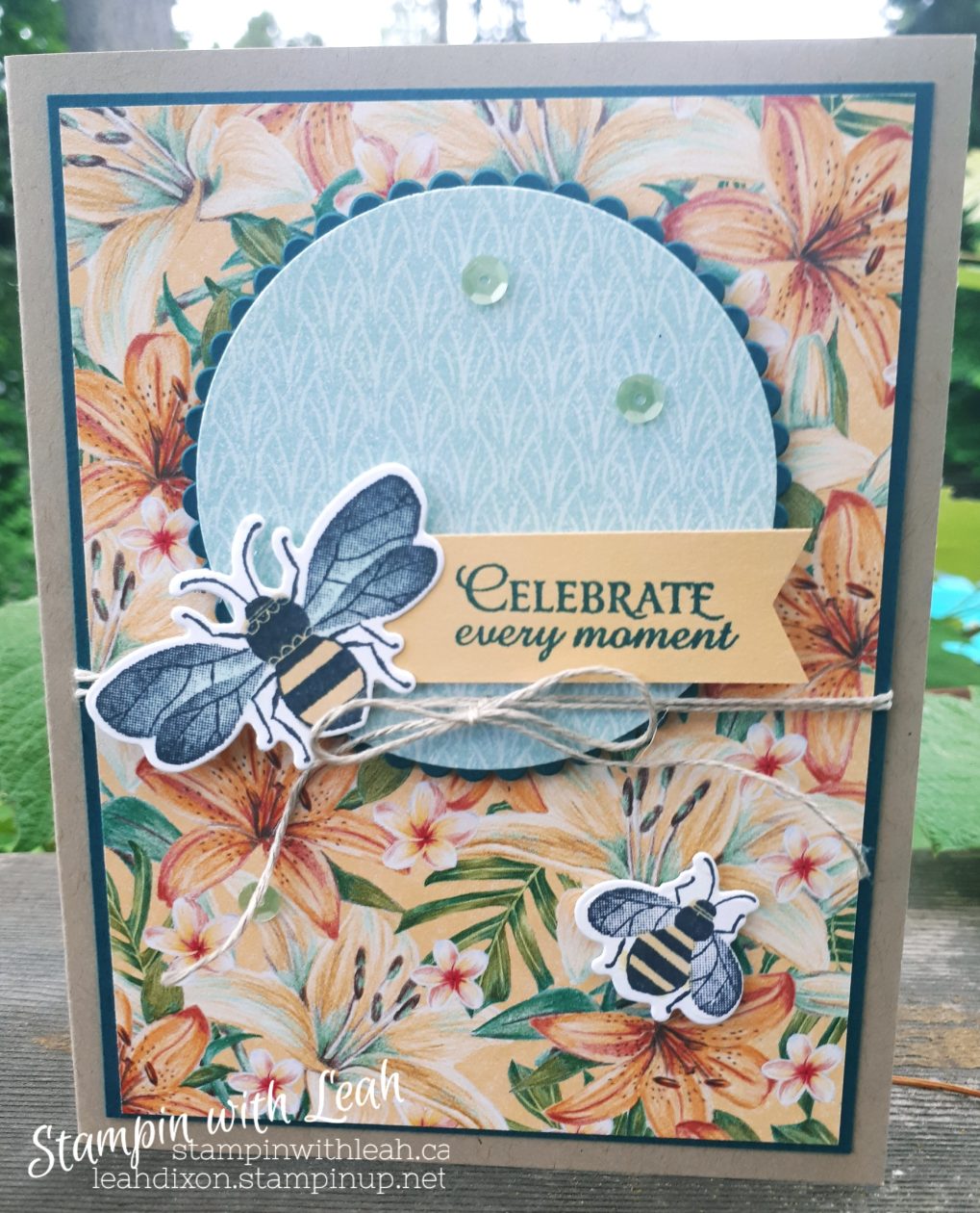 Good Morning! Thanks for visiting my site. I am still happily playing with product that will be retiring soon. Today’s card features the Honey Bee stamps and dies as well as the bright and fun Tropical Oasis DSP.