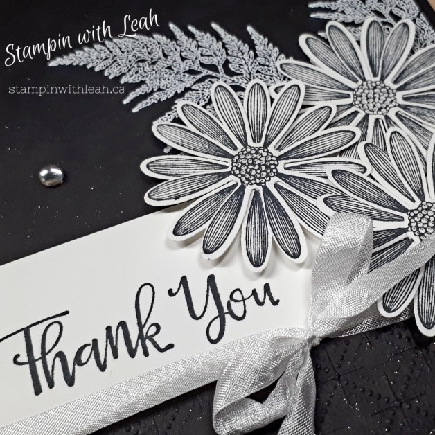 There are many little details on this card that I think make all the difference. First of all, the ferns were added with White embossing powder and the bottom of the black cardstock was dry embossed with the Dainty Diamonds embossing folder and then brushed lightly with Wink of Stella. At the top of the card I sponged white ink on the edges and then also brushed it with Wink of Stella. The Clear Epoxy Droplets add that rainy BC touch and the centers of the Daisy also received a Wink of Stella shimmer.