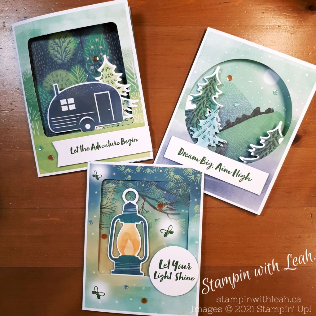 I just got back from a camping trip to find out that this month’s amazing camping themed Paper Pumpkin arrived today! These cards have a fun fold, lots of dimension and are SOOO pretty.