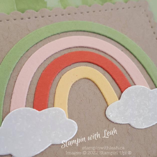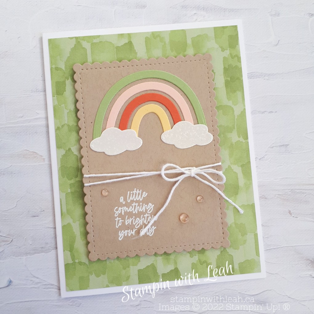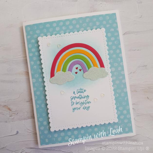 Every Wednesday morning I go live on FB and You Tube to create something using the Stampin’ Up! product that I am featuring that week. Today I focused on the fun Rainbow of Happiness bundle. Here are the two cards I created. They are nearly the same card in two different colour schemes. 🙂