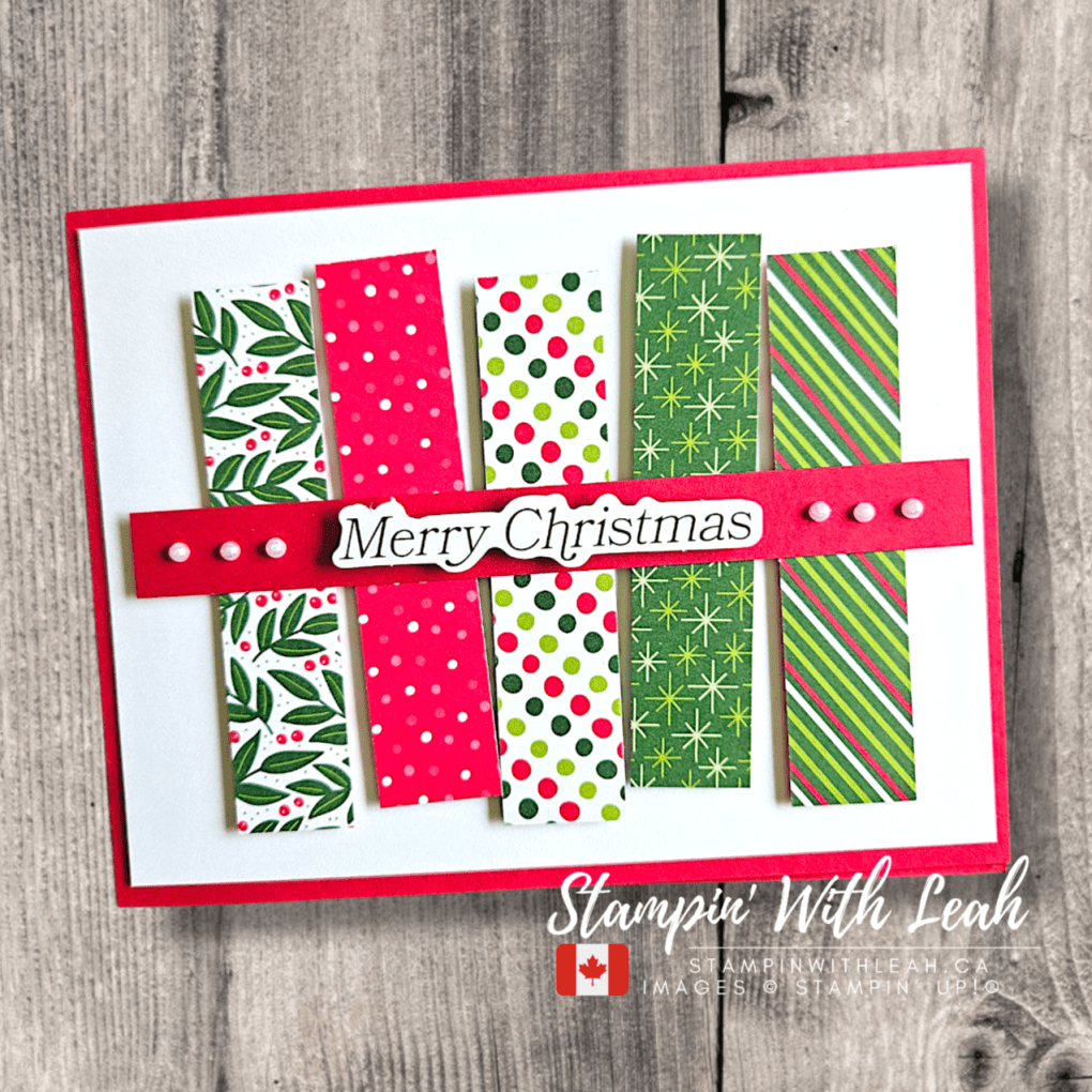 This handmade card features strips of the Take a Bow Designer Series Paper layered across a clean white background for a simple yet eye-catching design. I added a sentiment from the Greetings For All Ephemera Pack on a bright red banner, finishing with pearls for extra holiday sparkle.