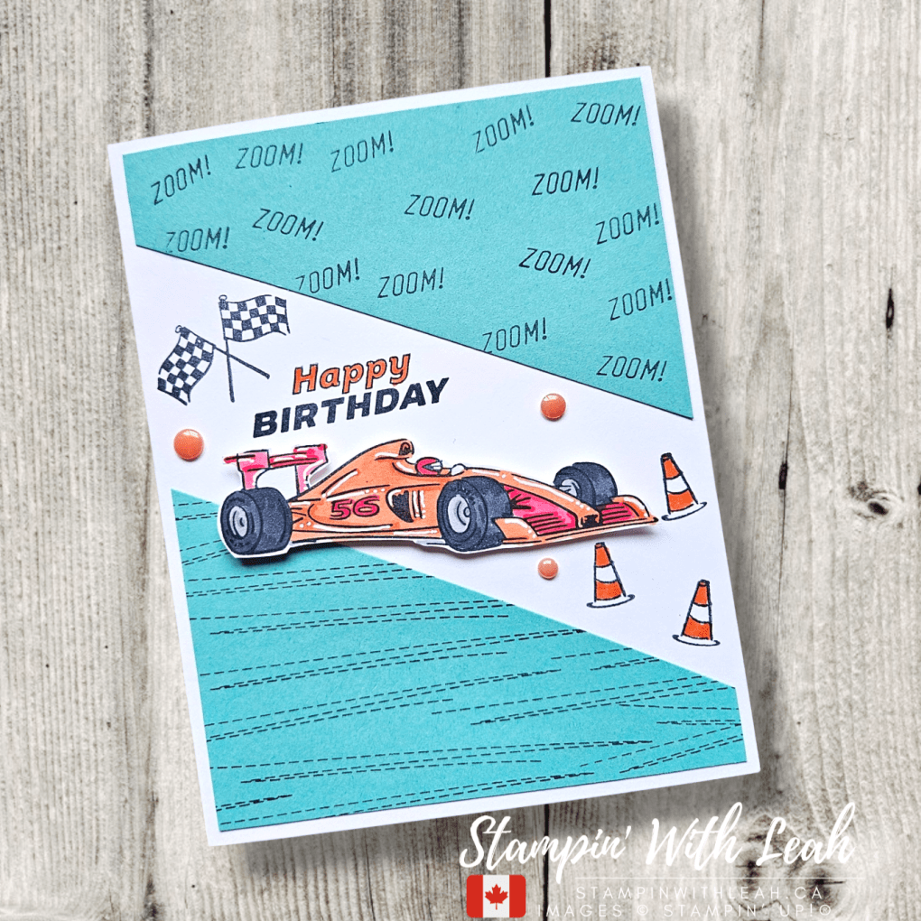 My base is Coastal Cabana, with blended panels to create a racetrack-style background. The repeated “ZOOM!” stamping adds to the sense of movement, while the angled design keeps your eye travelling across the card.