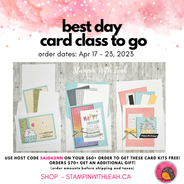 Join me every Wednesday morning for a FREE with purchase Card Class To Go. This week I featured Stampin’ Up!’s elegant Best Day stamp set and the Happy Forest Friends 12X12 DSP. Both of these items are retiring soon – you don’t want to miss them. You can see the replay of this week’s class, learn more about FREE SHIPPING (April 19th only!) and learn about how to get your make’n’take kit for this class below.