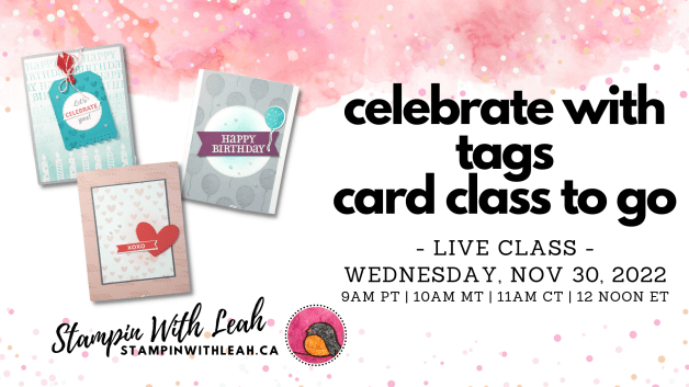 You can also sign up for my newsletter (link below) so you don’t miss out on any of my events. Right now I am offering registration for my Snowman Magic card class and my Birthday card Club – the first month is featuring this Celebrate With Tags Bundle!
