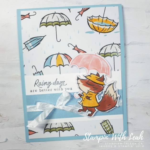 Here is my card created using the adorable Playing In The Rain bundle by Stampin’ Up!. I also used the soon to be retiring Rain or Shine DSP and a piece of Textured 12X12 Shimmer Paper.