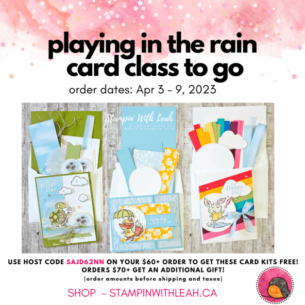 Join me every Wednesday morning for a FREE with purchase Card Class To Go. This week I featured Stampin’ Up!’s sweet Playing In the Rain bundle. You can see the replay of this week’s class below as well as more information about how to get your make’n’take kit for this class.