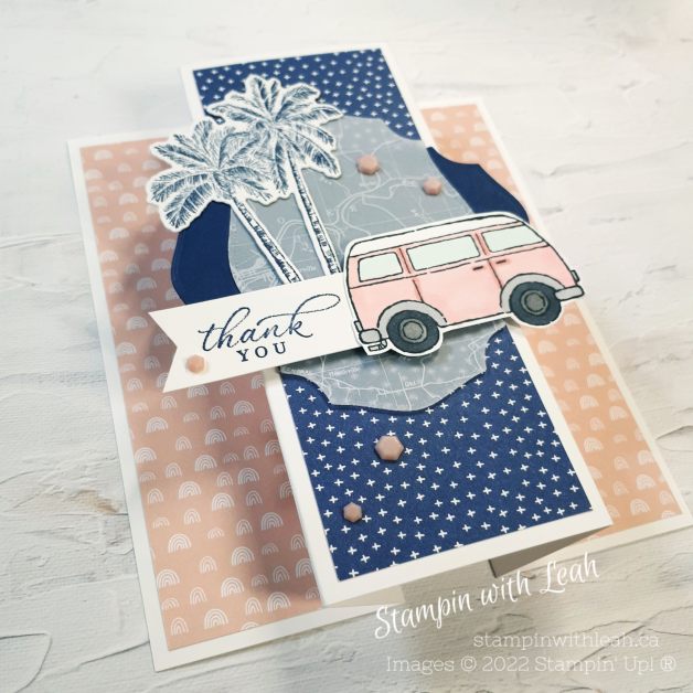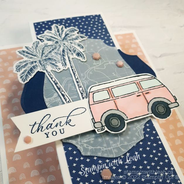 To create the front card candy I die cut a piece of Night of Navy cardstock and a piece of Layering Vellum using the largest label in the Tasteful Labels dies. I adhered them together in opposite directions (Navy horizontal, Vellum vertical). The I stamped the cute van from the FREE Driving By stamp set using Memento Black Ink, coloured it with Flirty Flamingo Stampin’ Blends and fussy cut it. Then I stamped the palm trees from Timeless Tropical using Night of Navy Ink and die cut them. Next, I stamped the thank you sentiment from Timeless Tropical using Night of Navy Ink on a 3/4″ X 2″ strip of Basic White cardstock. I used mini glue dots and Dimensionals to adhere all the bits to the card candy and then glued it to the center layer of the card front only. The light pink adhesive-backed Hexagons were the finishing touch.