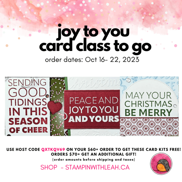 Join me every Wednesday morning for a FREE with purchase Card Class To Go. This week I featured Stampin’ Up!’s Joy To You stamp set. You can see the replay of this week’s class and learn about how to get your make’n’take kit for this class below.