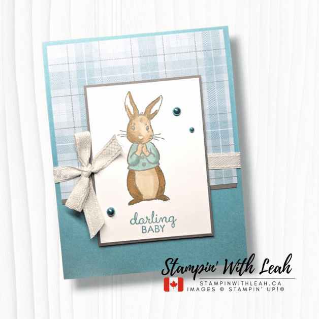 This darling bunny was stamped in Pebbled Path Ink (a soon to be retired colour) and coloured using Stampin’ Blends for a soft, storybook feel. I paired him with the gentle Lost Lagoon blue/green of the Timeless Plaid DSP, a soft Basic Beige ribbon bow, and a few Blooming Pearls for just the right amount of shine.