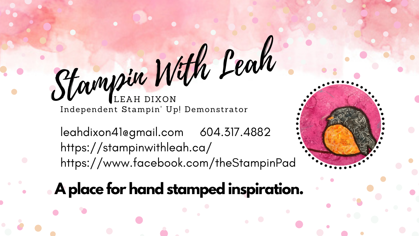 @stampinwithleah Request a Catalogue Sign Up For My Newsletter Free Tutorial Shop With Me Now Join my Team Visit My Blog Visit My Website Stampin’ Up! Canada Find Me on Facebook Find Inspiration at My Stamper’s Group Check Out My You Tube Channel