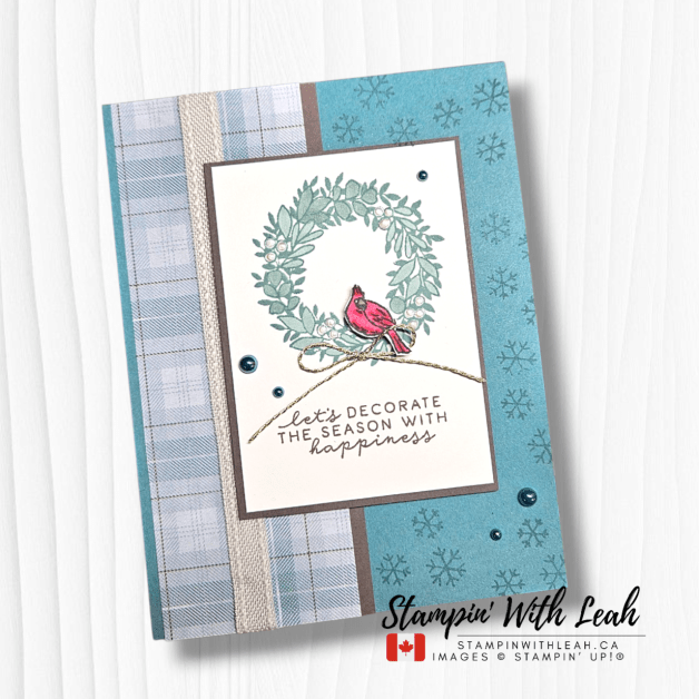 The wreath and sentiment are from the Sophisticated Sled stamp set, stamped in Lost Lagoon and Pebbled Path.