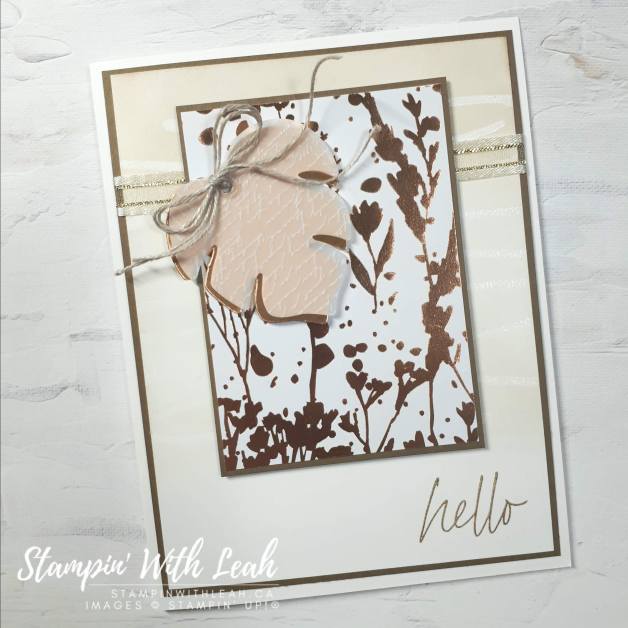 The background was created by stamping the stems across the card front and embossing them with Clear powder. Then I used Soft Suede to lightly blend ink over top. and attach it to a piece of Soft Suede CS. The copper panel is a piece of Naturally Gilded 12 X 12 specialty DSP (also a new Online Exclusive product) which I also attached to a piece of Soft Suede CS. The leaves were punched from a piece of Copper Foil and a piece of Vellum Layering Designs. I tied them together with some Linen Thread.