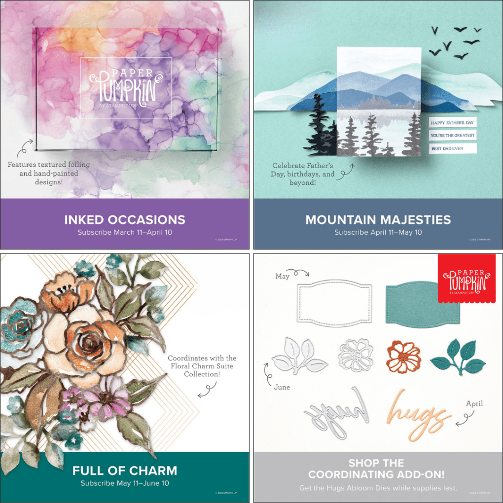 The April 2025 Paper Pumpkin Kit – Inked Occasions is available to order until April 10th! This special kit comes in a beautiful decorative box—you won’t want to miss it! You can also grab the Hugs Abloom Add-on Dies (166238) that coordinate with the April, May and June kits.