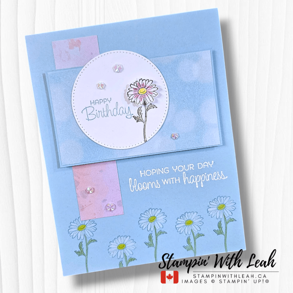 1️⃣ Background: I layered two soft Beautiful Bokeh DSP panel onto my card base. The blurred effect of this paper adds so much depth without extra work—so dreamy! ✨At the bottom of the card I stamped the daisy in Balmy Blue Ink and lightly coloured with Watercolour Pencils.