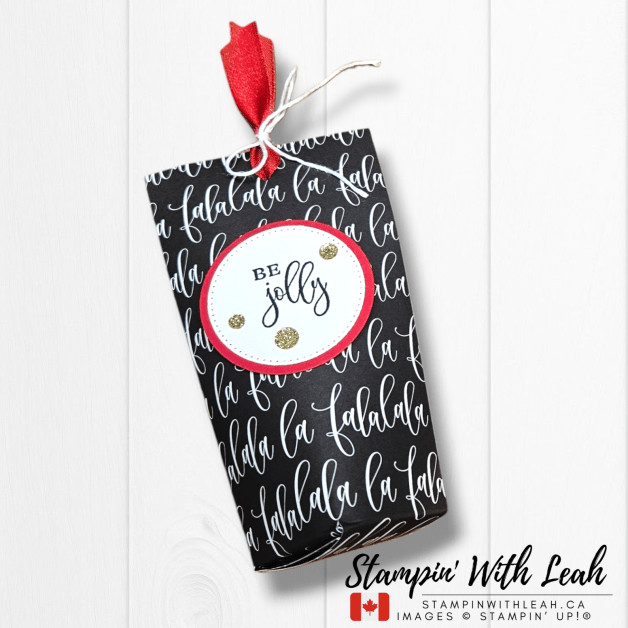This one features the striking black-and-white pattern from the Modern Christmas DSP. I paired it with the Real Red Shiny Ribbon (currently on the Last Chance List!), White Baker’s Twine, and a tag created with the 1-7/8″ Circle Punch and Stylish Shapes circles.