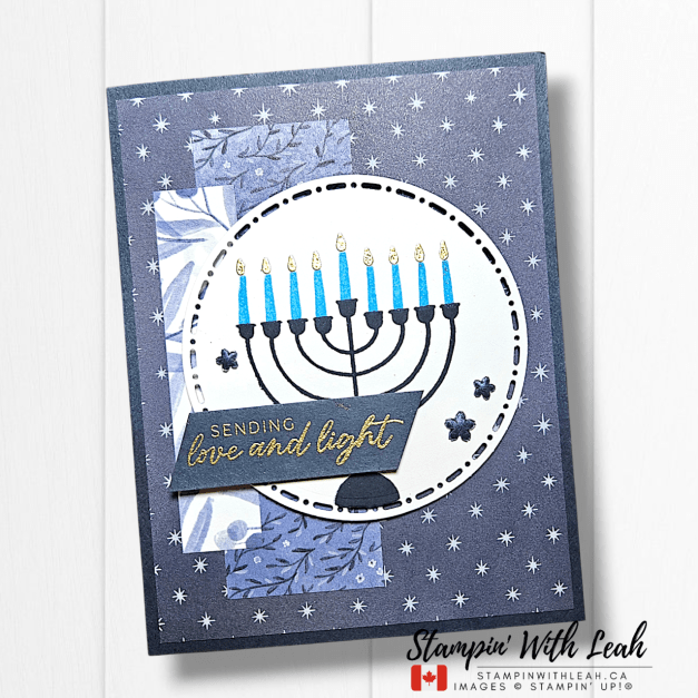 For this project, I paired the stamps with the calm, wintery patterns of the Peaceful Garden 12″ x 12″ Designer Series Paper, creating a beautiful backdrop for the menorah image.