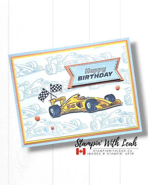 I stamped the race car in Cloud Cover Ink all over the Basic White layer. Then I stamped it again in Secret Sea. I coloured it with Stampin’ Blends ( Daffodil Delight and Timid Tiger), fussy cut it and attached it to the cardfrot using Dimensionals.
