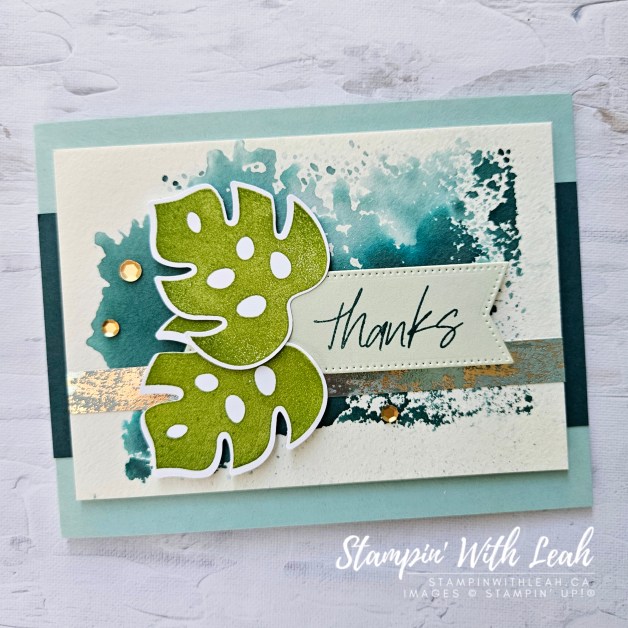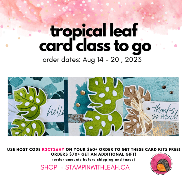 Join me every Wednesday morning for a FREE with purchase Card Class To Go. This week I featured Stampin’ Up!’s Online Exclusive Tropical Leaf stamp set and punch bundle. You can see the replay of this week’s class and learn about how to get your make’n’take kit for this class below.