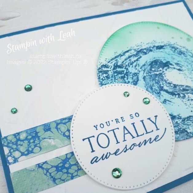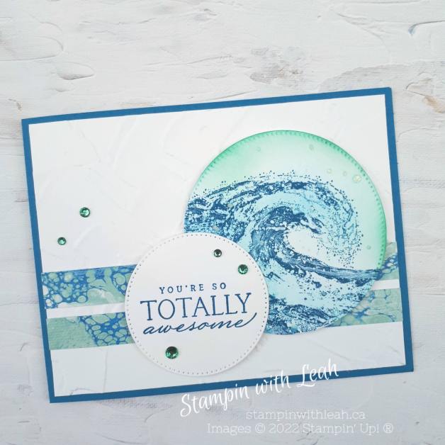 As soon as I saw this colour combo I thought of the fantastic Waves of Inspiration stamp set that Stampin’ Up! just released. I paired it up with the limited time only Waves of the Ocean 12X12 DSP and since the beautiful Waves Rhinestones are sold out – I used my dark Bermuda Bay Stampin’ Blends to colour some of our Basic Rhinestone Jewels.